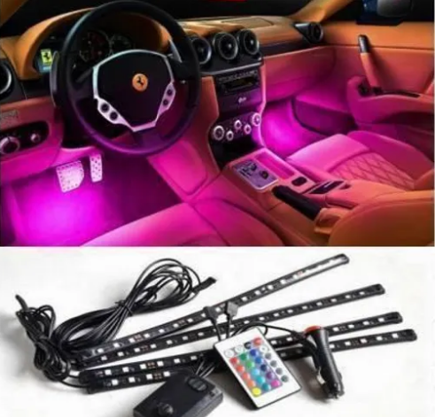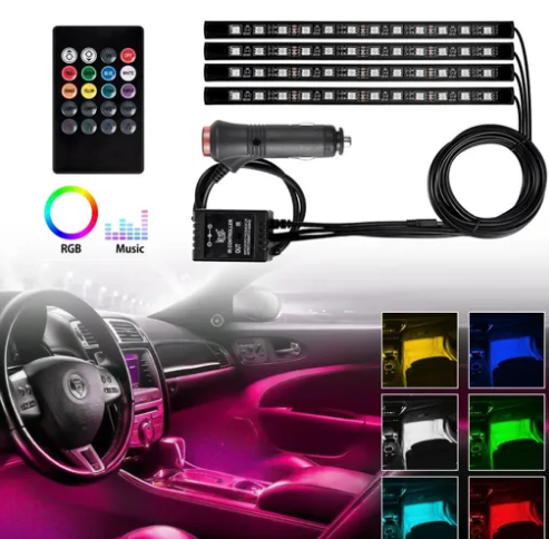 Voltage: DC 12V; Wattage: 10W; Bulb Quantity: 4pcs 48 LEDs, 12 LED/ Light. Most buyers perhaps will not use the remote control correctly, pls notice that: 1. The remote control should point directly to the black receiver box and there is no obstacle between them; 2. The remote should be put near the receiver box, not too far 8 Color RGB LED Car Interior Underdash Lighting Kit, Wireless Music Remote Control enables you to change the colour and adjust the brightness as you wish, also Sound-activated Function allows you to enjoy the fun with the colour changing following your car stereo music rhythm as well as your voice Flexible, UV & Water Resistant, Ultra Thin, High-quality Music LED Strip Light, can be easily installed in the gap and virtually invisible; Fits all Cars SUV vans trucks boats with DC 12V power Double-sided adhesive straps, directly inserted in the cigarette lighter, without modification. Simple design for you to decorate your car with a beautiful, exotic and romantic interior Package Includes 4 x SMD5050 Car LED Strip Lights; 1 x Remote Control.